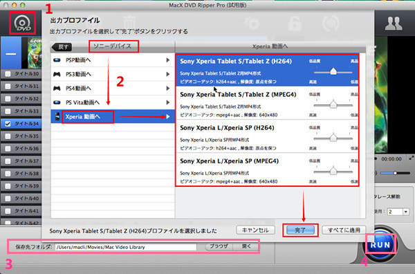 ステップ2:DVDディスクが入力されたら、出力プロファイルウィンドウが出てきた。操作手順は以下の通りである。「ソニーデバイス」⇒「Xperia動画へ」⇒「Sony Xperia Z3」⇒「完了」