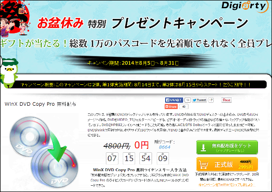 通常¥4800の有料DVDコピーソフト「WinXDVDCopyPro」がお盆休みキャンペーンで限定無料プレゼント中