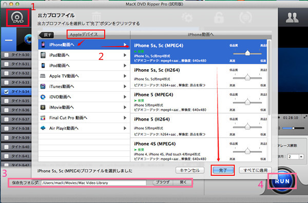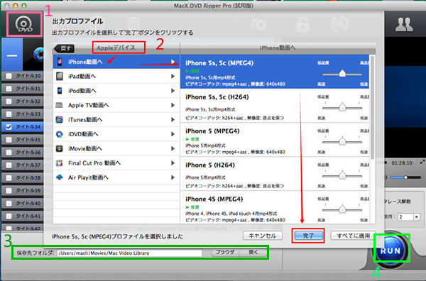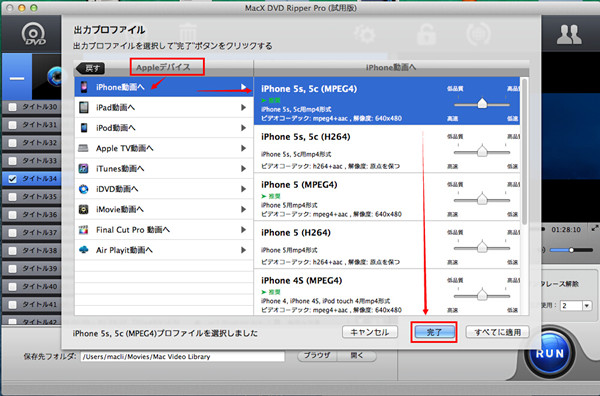 DVDディスクが入力されたら、出力プロファイルウィンドウが出てきた。操作手順は以下の通りで、「Appleデバイス」⇒「iPhone動画へ」⇒「iPhone5S,5C(MPEG4)/iPhone5S,5C(H264)」⇒「完了」