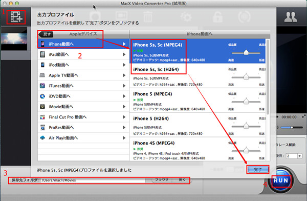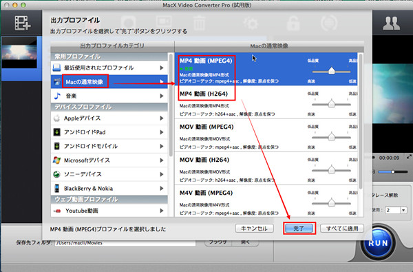 ステップ2:torrentファイルをソフトに追加された後に、出力プロファイルの窓口が自動的に出てきた。操作手順は以下の通りである。「Macの通常映像」⇒「MP4動画(MPEG4)・MP4動画(H264)」⇒「完了」