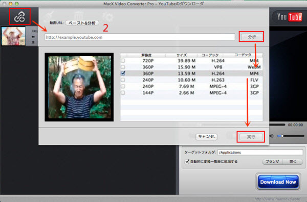 左上側にある「リンク」アイコンをクリックしてください。ダウンロードしたいアイスバケツチャレンジ動画のURLをテキストボックスに貼り付けて、「分析」/「ペースト&分析」をクリックしてください。分析された後、動画ファイルの解像度によって、幾つかの出力フォーマットが表示され、ひとつを選んで「実行」をクリックしてください。