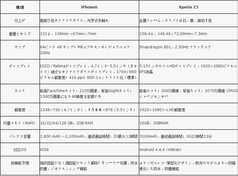 上記の通り、注目のiPhone6は前モデル5Sより大きくて、薄い。解像度もアイフォン5Sより遥かに高いと言った。それに対して、Xperia Z3は既存のXperia Z2よりもっと薄くなることが最大の注目ポイントである。既存のXperia Z2に比べて小型化・薄型化。iPhone6とXperia Z3それぞれのメリットとデメリットがあり、iPhoneの常連ユーザーは大人気のiPhone6の一人勝ちと思っているが、ソニーのXperia Z3のコンパクト化や防水防塵4K動画撮影対応などという新機能に気になる人はiPhone6ではなく、Xperia Z3を選択する。だから、「iPhoneとSony勝つのはどちら」ということは人によって違う。