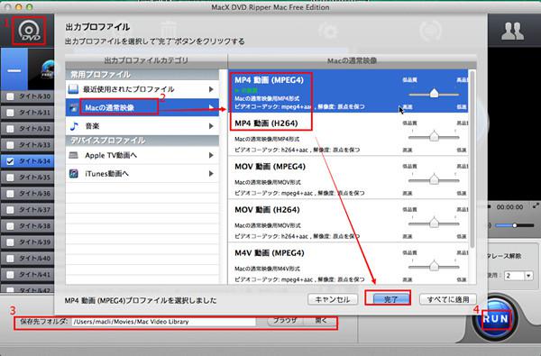 ステップ2:DVDが追加されたら、出力プロファイルの選択界面が自動的に表示される。こういう順番:「Macの通常映像」⇒「MP4動画(MPEG4)/MP4動画(H264)」⇒「完了」;
