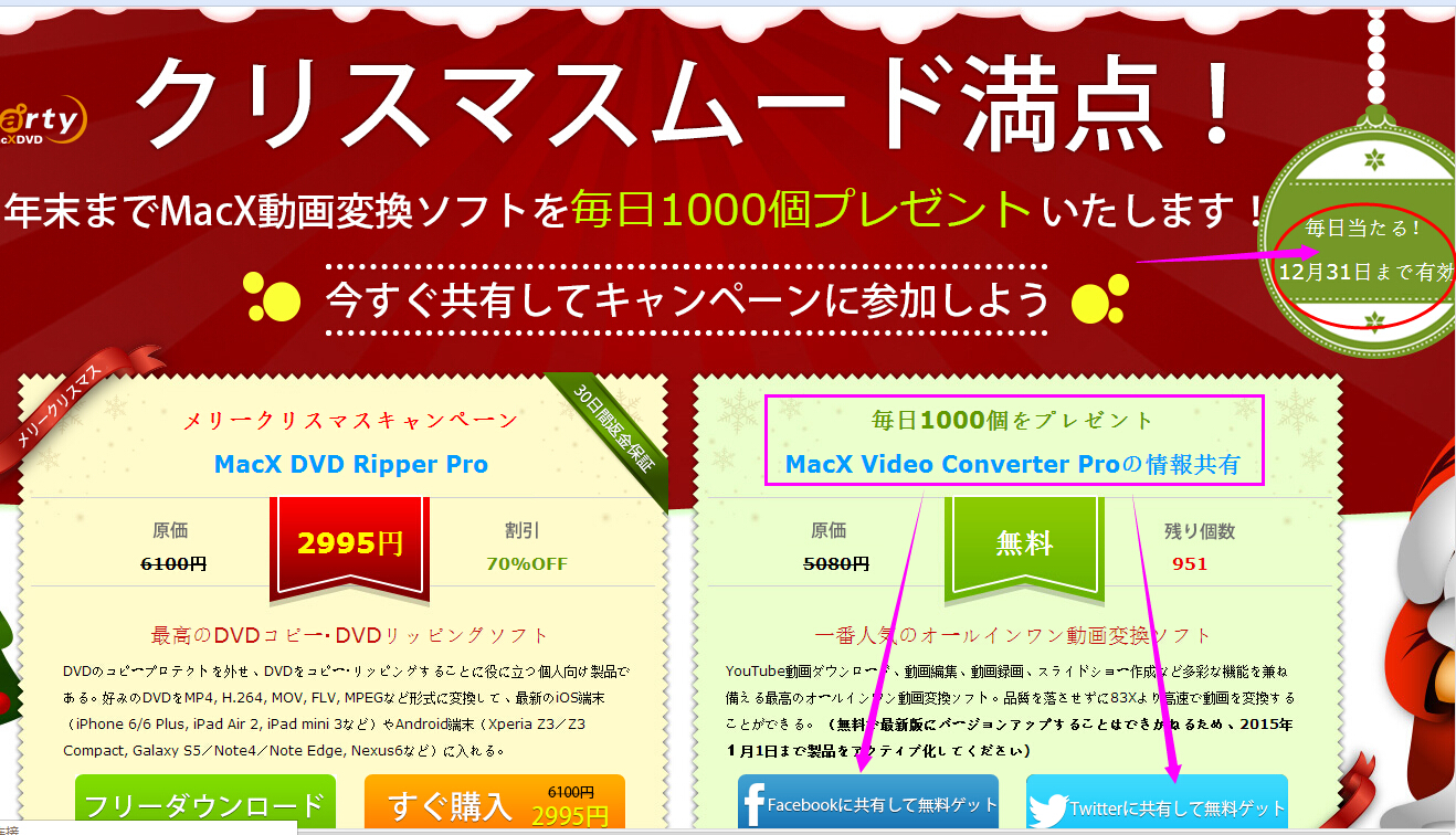 Digiarty社は今から12月31日(水)までMacXクリスマスプレゼントキャンペーンが開催しております。毎日オールインワン動画変換ソフトMacX Video Converter Proを1000個プレゼントいたします!同時に、人気ソフトの割引セールもお届けいたします。